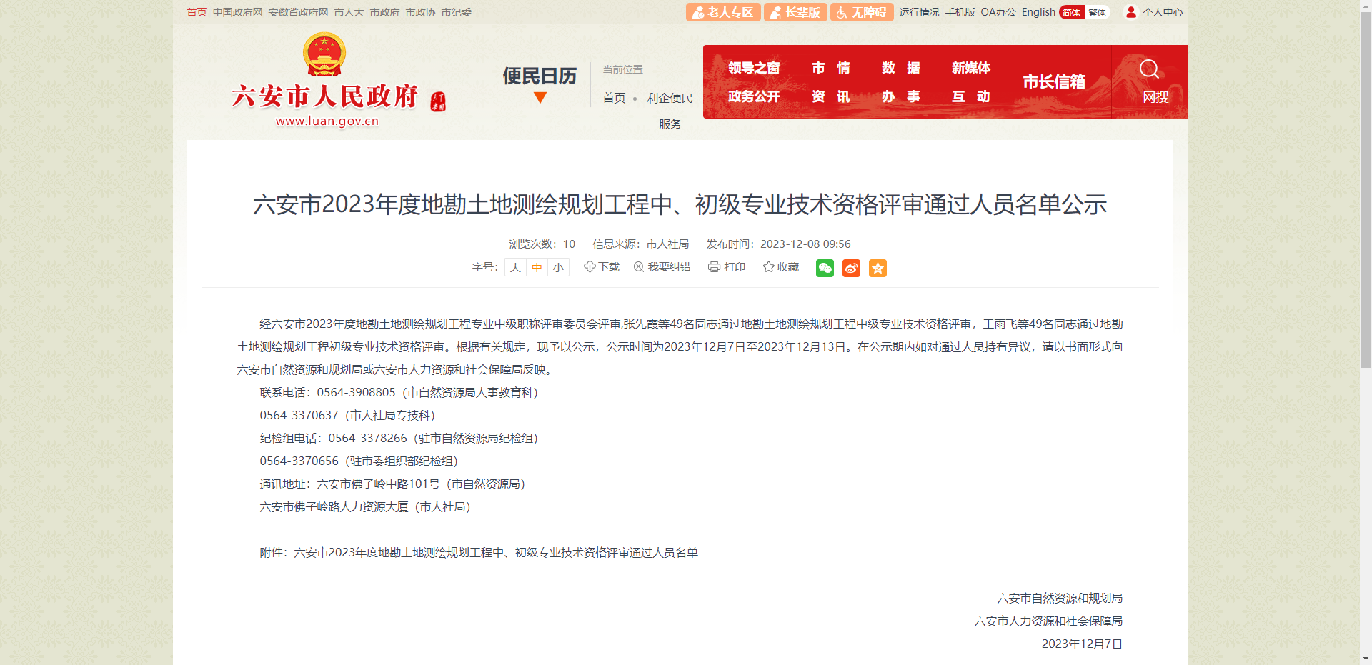 经6安市2023年地勘土地测绘规划工程中级职称评审委员会评审,张先霞等49名同志通过地勘土地测绘规划工程中级专业技术资格评审,王宇飞等49名同志通过地勘土地测绘规划工程初级专业技术资格评审。根据有关规定,现予公示,公示时间为2023年12月7日至2023年12月13日。公示期内对通过人员有异议的,请以书面形式向六安市自然资源和规划局或六安市人力资源和社会保障局报告。