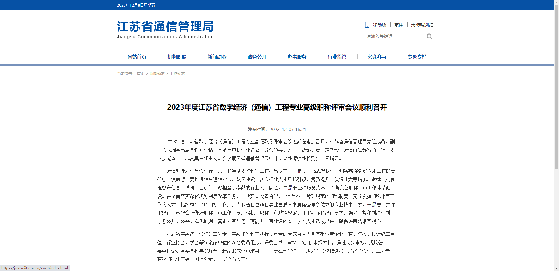 2023年江苏省数字经济(通信)工程专业高级职称评审会议最近在南京召开。江苏省通信管理局党组成员、副局长张瑞英出席会议并讲话。各基础电信企业省公司负责人、人力资源部负责同志出席会议。会议由江苏省通信行业职业技能鉴定中心主任夏浩主持。会议期间,省通信管理局纪律检查处处长谭雅出席会议进行监督指导。